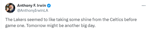 Anthony Irwin表示,看起来与湖人的面谈已经结束了,湖人队似乎喜欢在赛前从凯尔特人队手中抢风头,明天可能又是重要的一天。