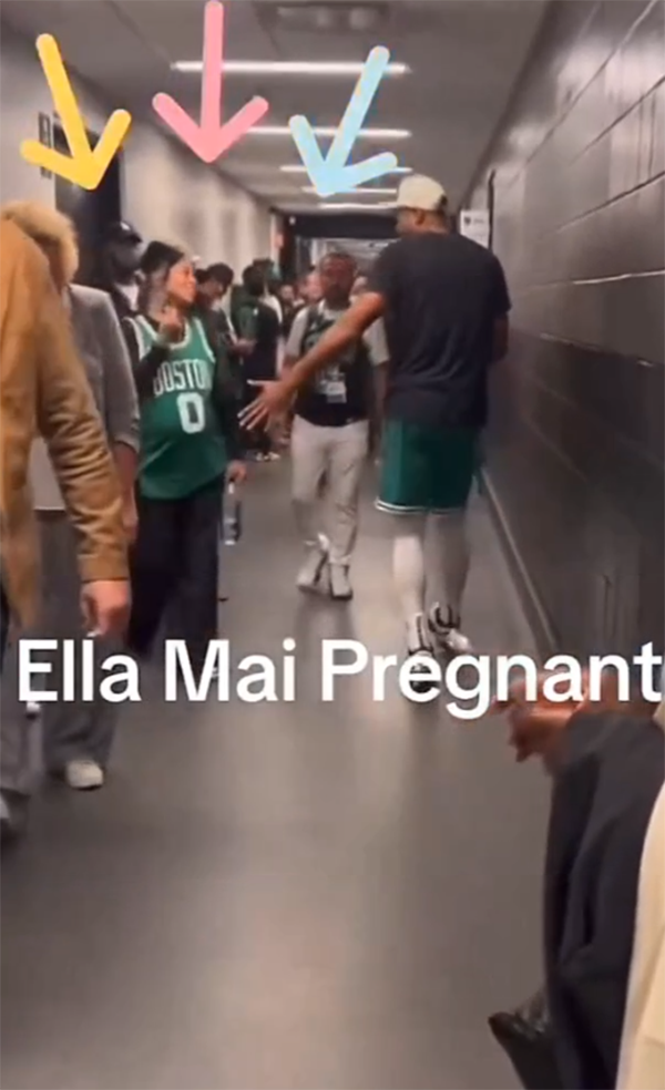 在凯尔特人夺冠派对上,塔图姆绯闻女友也来了,英国女歌手艾拉-麦身穿塔图姆0号球衣,在球员通道中与霍福德击掌拥抱,29岁的艾拉-麦挺着大肚子,孕肚突出,很明显她已经怀孕很久了。