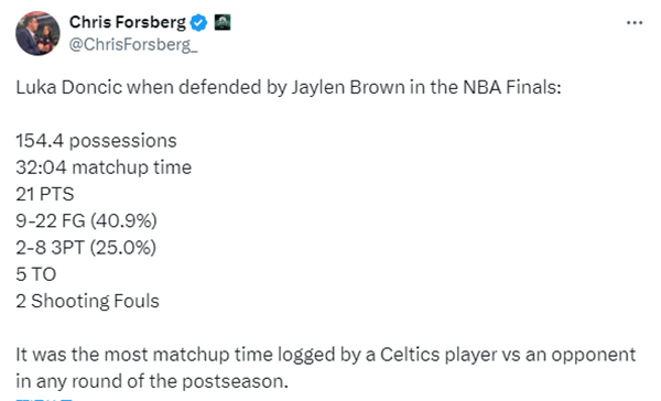 凯尔特人记者Chris Forsberg报道,杰伦-布朗在总决赛上主防东契奇的回合数是154.4个,时间是32分04秒,在这期间东契奇一共22投9中(40.9%),三分8中2(25.0%),得到21分,出现5次失误,造成2次投篮犯规;这是凯尔特人球员在今年季后赛中与对手对位时间最长的一次(杰伦-布朗对位东契奇)。