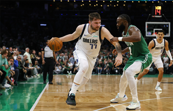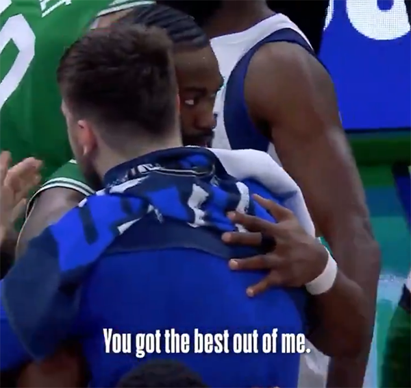 在总决赛G5赛后,塔图姆拥抱队友疯狂庆祝夺冠,独行侠众将主动过来祝贺对手;东契奇和杰伦-布朗紧紧相拥,布朗搂着东契奇说:卢卡,你是一个杀手,你让我发挥出了最好的一面。我爱你,兄弟!