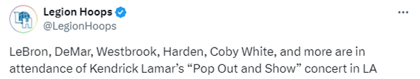 公牛球员德罗赞和科比-怀特也来到洛杉矶参加音乐会,球迷调侃既然阿赞来到LA,那就别回去了;本赛季,德罗赞为公牛出战79场比赛,场均拿到24分4.3篮板5.3助攻,据悉,公牛希望与德罗赞续约,不过双方还没有达成协议。