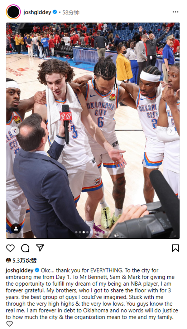 雷霆众球员纷纷告别吉迪,亚历山大在评论区回复哭泣表情,杰伦-威廉姆斯:去变得伟大;杰林-威廉姆斯:我们会想念你的。