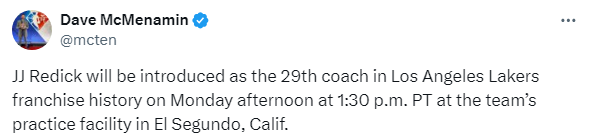 来源:JRS直播网06-24 11:29JRS直播网讯 北京时间6月24日,湖人官方宣布,他们将在明天凌晨1点30分为新帅雷迪克召开新闻发布会,位置是加利福尼亚州埃尔塞贡多的球队训练场,湖人将正式宣布雷迪克成为球队历史上的第29任主教练。