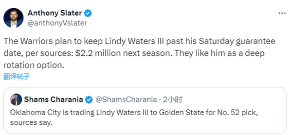 据雅虎记者Jaker Fisher报道,勇士将52号选秀权送至雷霆,换来林迪-沃特斯,随后Shams也确认这一交易;据悉,沃特斯2024-25赛季是价值220万美元的球队选项,勇士计划执行球队选项将其留下,希望他成为球队深度轮换的人选。