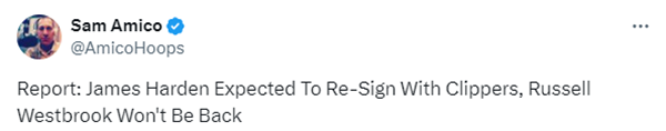据快船记者Tomer Azarly报道,哈登预计与快船续约,威少下赛季预计不会为快船效力。