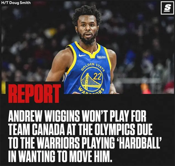 近期,名记DOUG SMITH报道,勇士队和维金斯之间的关系非常紧张,勇士队将对于维金斯采取强硬的手段,并且打算交易他。勇士队为何会有如此强硬的态度呢?答案很简单,因为维金斯入选了加拿大男篮20人集训名单,如果没有意外的话,维金斯将代表加拿大参加巴黎奥运会。