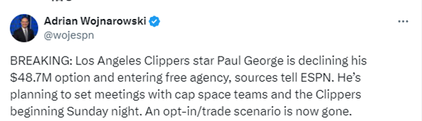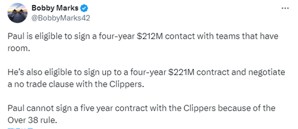 薪资专家Bobby Marks报道,乔治与其他球队有资格签4年2.12亿顶薪,还有资格与快船队续签一份为期四年、价值 2.21 亿美元的合同,且有资格获得不可交易条款。 由于超过 38 岁的规定,保罗无法与快船队签订五年合同。