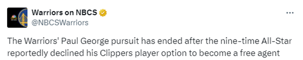 Chris Haynes跟进报道,76人预计会积极追求保罗-乔治,并且是乔治争夺战的有力竞争者。Michael Scotto也表示76人将强烈追求乔治,他们拥有足够的薪资空间。