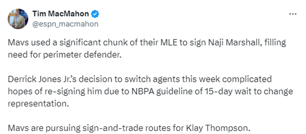 独行侠3年2700万签约马绍尔后,独行侠记者Tim MacMahon报道称,独行侠用了中产中的大部分来签约马绍尔,这可能意味着他们没有足够的钱来留小琼斯。小琼斯此前将经纪公司更改为Klutch,根据联盟规则,更换经纪公司之后15天后才能正式使用。