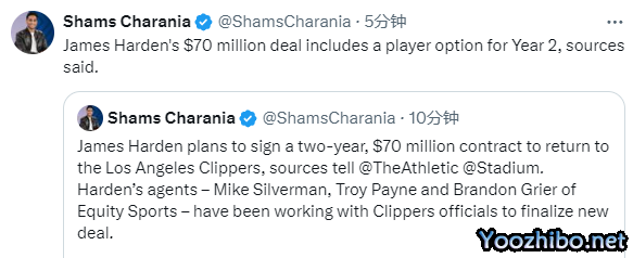 shams报道,詹姆斯-哈登计划签署一份为期两年、价值 7000 万美元的合同重返洛杉矶快船队,哈登的三位经纪人一直在和快船官员进行合作,敲定新合同。