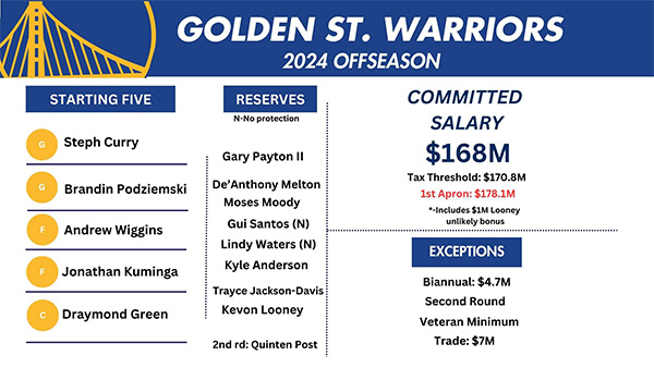勇士队现有13名球员——库里、维金斯、库明加、波杰姆斯基、追梦格林、小佩顿、梅尔顿、穆迪、沃特斯、桑托斯、卢尼、TJD和李凯尔,目前新赛季总薪水为1.68亿美元。