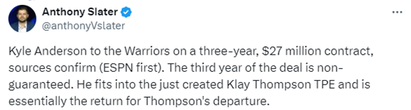 勇士记者Anthony Slater报道,李凯尔与勇士签下3年2700万合同,他正好符合克莱-汤普森签换交易创建的交易特例,是汤普森离队的补偿。