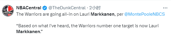 接下来勇士将继续探索交易,勇士随队记者Monte Poole报道,马尔卡宁是勇士目前的头号目标,勇士将会全力争取拿下他。不过除了勇士外,国王、马刺和鹈鹕也想引援马卡。