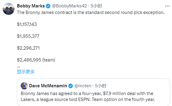 詹姆斯续约后布朗尼也签约了,湖人官方晒出布朗尼的签约照;据湖人记者报道,布朗尼和湖人签下4年790万美元合同,第四年为球队选项;薪资专家Bobby Marks进一步报道,布朗尼新秀赛季的年薪为116万美元,第二年196万美元,第三年230万美元和第四年249万美元(球队选项)。