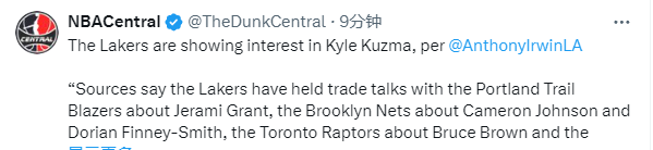 湖人还能升级阵容吗?湖人记者Anthony Irwin报道,湖人队已经与波特兰开拓者队就格兰特、布鲁克林篮网队就卡梅隆-约翰逊和芬尼-史密斯、多伦多猛龙队就布鲁斯-布朗和才队就库兹马以及其他球队和其他交易目标进行了交易谈判。到目前为止,这些名字是与湖人队联系最紧密的。