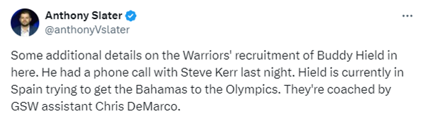 Slater和shams还联合报道,目前希尔德在西班牙为巴哈马男篮参加奥运资格赛,昨晚勇士主教练科尔打电话招募了希尔德。