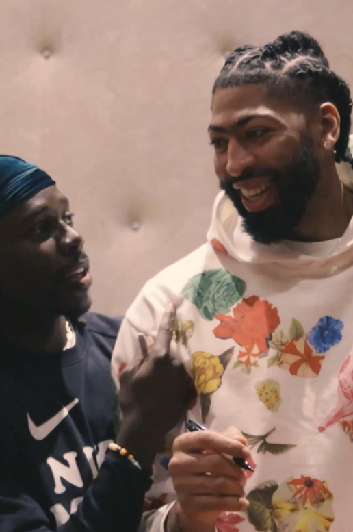 浓眉身穿一件LV潮气十足的白色卫衣,满脸笑容心情大好,在篮球上留下亲笔签名;期间绿军夺冠大功臣霍乐迪也来了,与浓眉开心热聊。