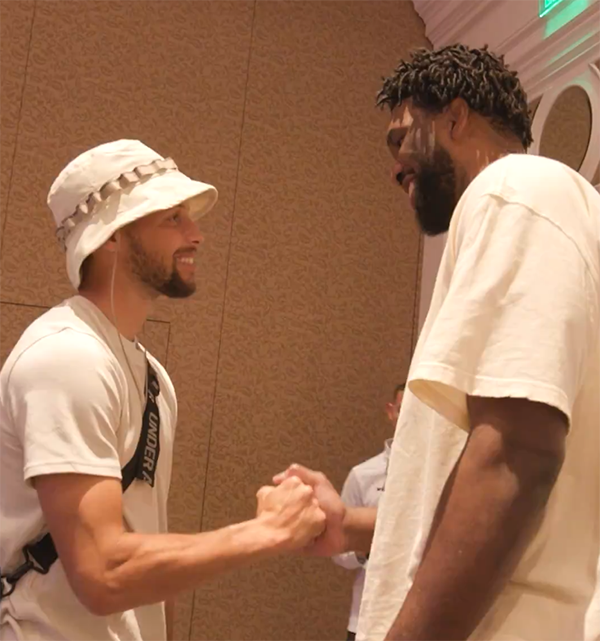 美国男篮众将亮相拉斯维加斯,库里穿着拖鞋、提着装备,与恩比德握手拥抱,两人都咧嘴笑十分开心,这是他们第一次代表美国男篮参加奥运会。