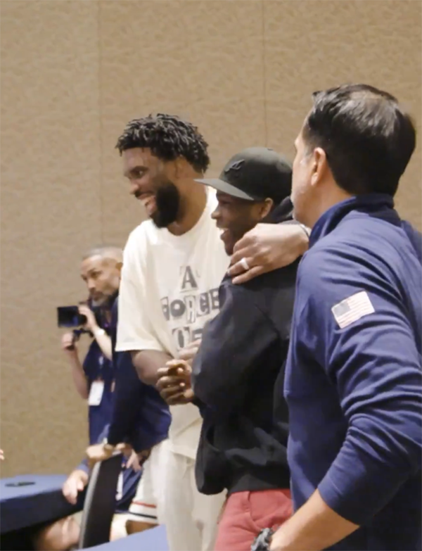 杜兰特身穿黑色卫衣、十分抢镜的条纹短裤,背着双肩包来到现场,与哈利伯顿击掌、与恩比德击掌并且紧紧拥抱;这是杜兰特第4次代表美国男篮参加奥运会,此前三次他都带队拿到金牌,冲击个人奥运四连冠的伟大成就。