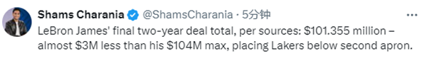 据此前报道,詹姆斯和湖人续签2年1.04亿美元大合同,其中第二年为球员选项,合同还包含交易否决权。不过根据shams最新报道,詹姆斯2年合同总额为1.0135亿美元,为了让湖人薪资降到第二土豪线以下,詹姆斯选择降薪接近300万美元。