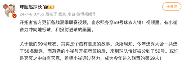 媒体人球圈赵探长表示:“关于他的59号球衣,其实是个蛮有意思的故事。众所周知,今年选秀大会一共选了58名新秀,而落选的小崔与开拓者签约后,来到球队恰好被分到了59号。或许是冥冥之中自有天意,希望小崔通过努力,成为今年进入联盟的第59人!”