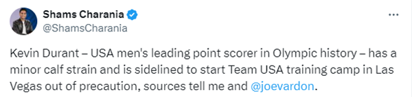 杜兰特是美国男篮奥运历史得分王,他已经三次带领美国队夺得奥运金牌;消息人士称,杜兰特的伤势并不严重,他已随队来到了拉斯维加斯,但不确定能否出战周四对阵加拿大男篮的热身赛。