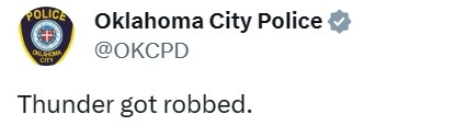 库里准绝杀一球引发巨大争议,雷霆记者晒照表示是格林推着基迪的手碰到篮网的;俄克拉荷马警察局更推道:“雷霆被抢劫了。