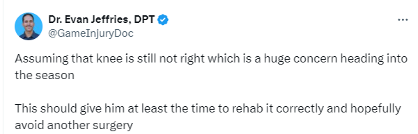 对于小卡的情况,医学专家Evan Jeffries表示:我想他的膝盖依然没有痊愈,这对即将到来的赛季来说是一个巨大的隐患。退出奥运会至少能让他有时间正确地进行康复,希望能避免再次手术。