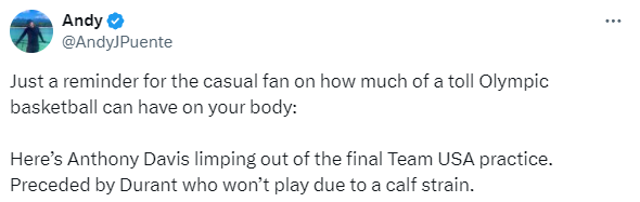 有人晒出美国男篮众球员离开球馆的画面,浓眉一瘸一拐疑似受伤,美记者Andy J Puente表示:奥运篮球会对身体造成多大的损害: 这是安东尼-戴维斯一瘸一拐地走出美国队最后一次训练的画面;杜兰特之前因小腿拉伤而无法上场。