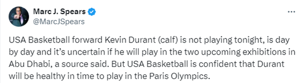 由于小腿伤势,杜兰特缺席了很多训练并且确定无法出战美国男篮与加拿大的热身赛。