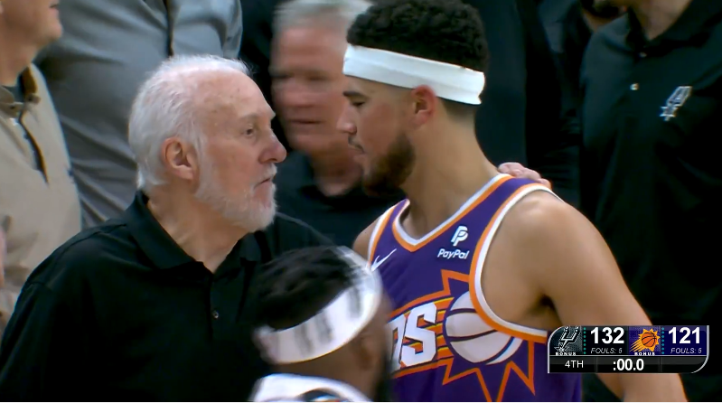 据统计,在马刺再次击败太阳的最后4分15秒,文班亚马4中4,得到10分,而太阳整队10投仅1中,得到5分;文班一个人打崩太阳全队;赛后文班亚马和杜兰特拥抱,KD被逗笑后推了一下文班,笑着离场。