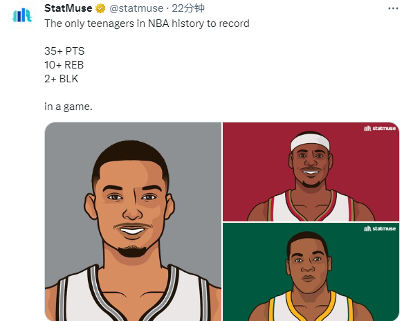 5、文班亚马是NBA历史上第三位单场砍下至少38分10篮板2盖帽的青少年球员(13-19岁),此前两位是詹姆斯和杜兰特。