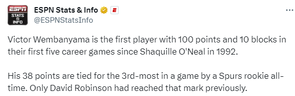 8、文班成为92年奥尼尔之后生涯前5场得分突破100分且至少10帽的球员
