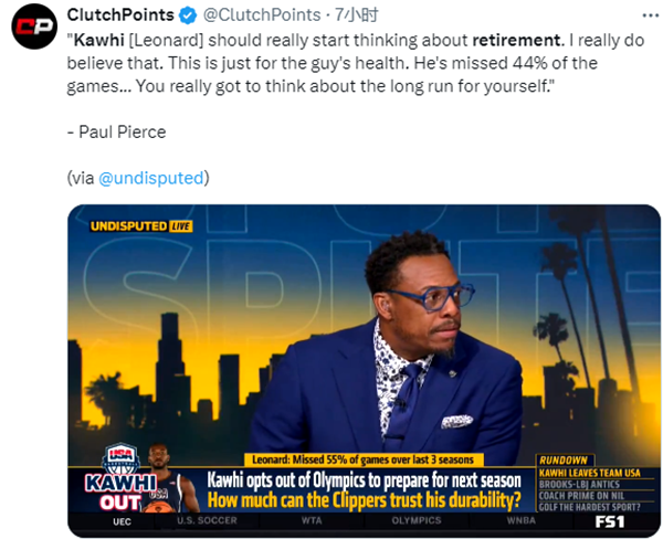 小卡退出国家队,保罗-皮尔斯在节目中狠批小卡:科怀(莱昂纳德)真的应该开始考虑退役了。我真的这么认为。这只是为了他的健康,他已经缺席了44%的比赛,你真的应该为自己考虑长远的事情。