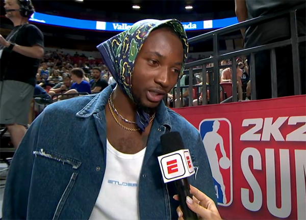 值得一提的是,维金斯、卢尼、小佩顿都坐在场边观战,库明加也来了,他戴着小碎花头巾接受采访,这造型十分抢镜且引球迷热议。