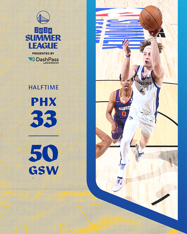 第二节勇士一直压制太阳而且最多领先到22分,即使太阳反扑追分,半场打完勇士仍50-33领先17分,期间波杰再次命中三分球,罗和普劳登都输送火力,他们三人半场合砍34分,波杰半场8中4拿到12分4篮板1助攻。