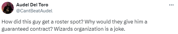 更有球迷表示这个家伙怎么获得名单位置的?为什么要给他保障合同?奇才队就是一个大笑话。