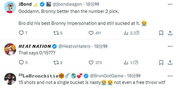 萨尔15中0被骂惨了,有球迷表示:天哪,布朗尼给你比榜眼打得好,兄弟已经在尽力模仿布朗尼了;还有球迷表示:15次投篮一次都没进,甚至连罚球也没进。