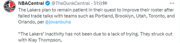 Jovan Buha还表示,湖人今夏的无所作为并不是因为缺乏努力。他们未能成功引进克莱-汤普森,也无法得到其他有影响力的自由球员如瓦兰丘纳斯和德罗赞,到目前为止也未能在与开拓者、篮网、爵士、猛龙和魔术的交易谈判中找到交易方式。消息人士透露,湖人预计将在改进阵容的过程中保持耐心。