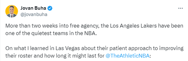 Jovan Buha报道,在今年自由球员市场上,湖人是NBA最沉默的球队之一;到目前为止,他们聘请了雷迪克担任主教练,通过选秀获得克内克特和布朗尼以及续约詹姆斯和克里斯蒂,但湖人并没有进行实质性的补强。