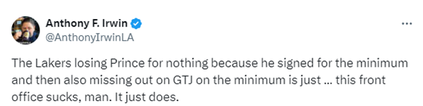 今夏,即使詹姆斯甘愿大幅降薪,湖人仍旧接连错失汤普森、哈登、瓦兰丘纳斯以及德罗赞;湖人目标特伦特也已经加盟雄鹿而且接受1年老将底薪合同,Anthony Irwin炮轰湖人管理层:湖人队白白失去了普林斯,因为他签了底薪合同,然后又错过了只签底薪的特伦特,湖人管理层太烂了。