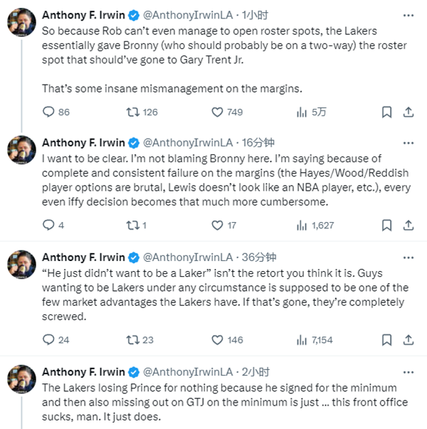 湖人引援接连受挫,错失特伦特后名记Anthony Irwin炮轰湖人管理层:湖人队白白失去了普林斯,因为他签了底薪合同,然后又错过了只签底薪的特伦特,湖人管理层太烂了。无论如何,球员们都想成为湖人队的一员,这应该是湖人队为数不多的市场优势之一。如果失去了这一点,他们就彻底完蛋了。