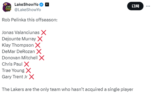 湖人美媒列出湖人今夏错失的目标——瓦兰丘纳斯、汤普森、德章泰-穆雷、德罗赞、米切尔、保罗、特雷-杨和特伦斯,还晒照调侃湖人:同样给底薪,特伦特跳过湖人签约雄鹿。