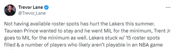 湖人另一记者Trevor Lane表示:今夏没有可用的阵容位置对湖人的伤害很大,普林斯想要留下来却最终底薪加盟雄鹿,特伦特也底薪加盟雄鹿;湖人大名单已经满额,其中有一些球员很可能无法参加NBA比赛。