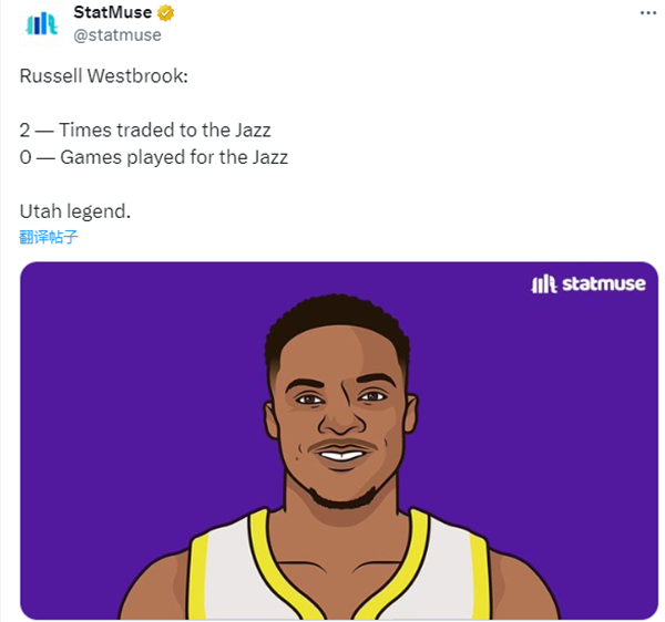 威少连续2年被交易到爵士,却从未为爵士打过比赛,美媒调侃威少是犹他传奇。