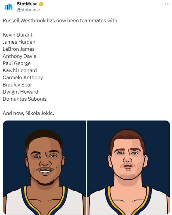 美媒晒出威少生涯至今合作过的全明星——杜兰特、哈登、詹姆斯、浓眉、乔治、莱昂纳德、安东尼、比尔、霍华德、小萨,现在他将联手约基奇。