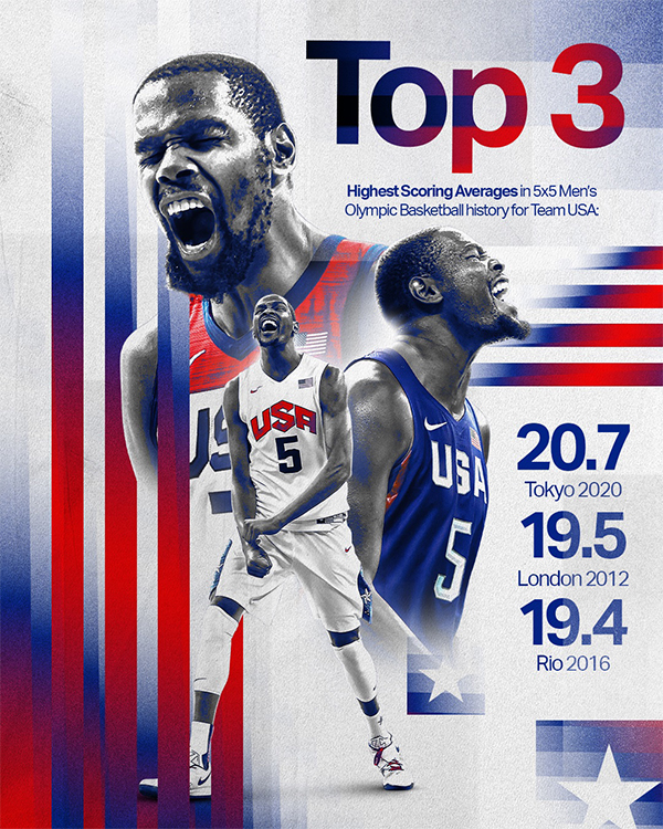 杜兰特是美国男篮队史奥运赛场上的最强得分手,2020年东京奥运会,杜兰特场均20.7分带队夺冠,2016年里约奥运会,杜兰特场均19.4分以及2012年伦敦奥运会场均19.5分,在美国男篮队史单次奥运会场均得分榜上,杜兰特一人包揽前三。
