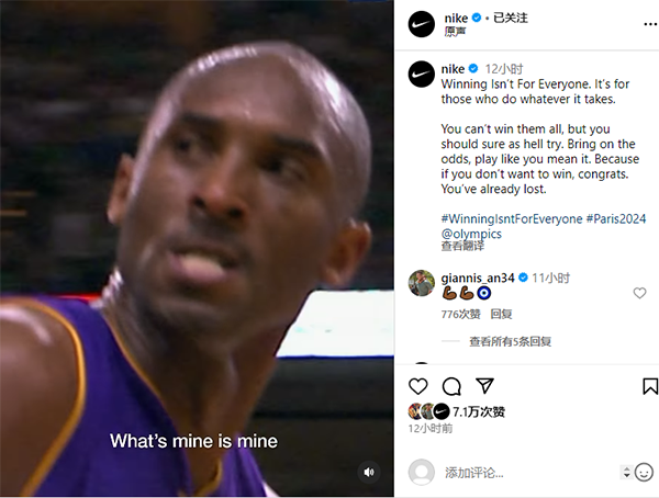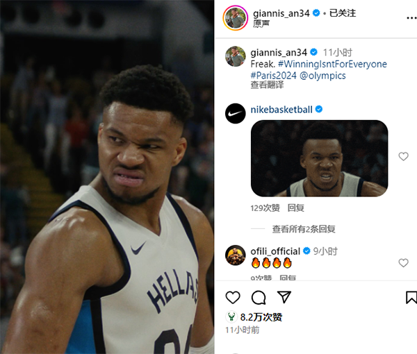 耐克发布奥运宣传片,詹姆斯转发并且写道:我打球是为了赢,你呢?,字母哥转发了广告并配文写道:怪物!
