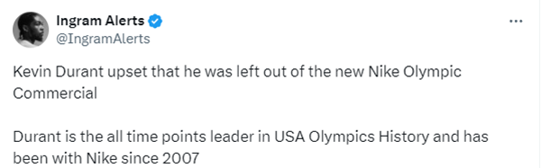 不过由于无缘耐克官方的巴黎奥运广告宣传片《胜利不属于每个人》,杜兰特明显不开心了,更新Ins晒训练照并且写道:@耐克 跟我说说,我这么招人恨吗???