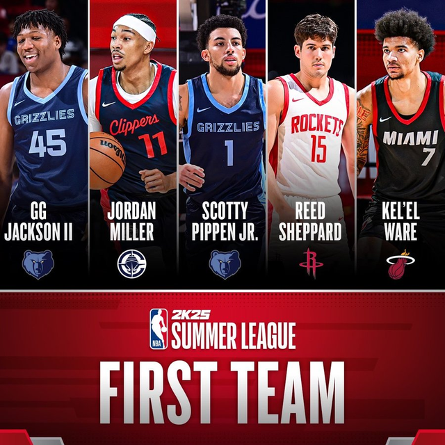 最佳阵容一阵:包括灰熊的 GG-杰克逊二世、快船的乔丹-米勒、灰熊的小斯科蒂-皮蓬、火箭的里德-谢泼德、热火的克莱尔-韦尔;